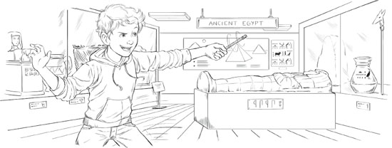 Tom loved history and liked to pretend he could travel through time. He lunged towards a brightly painted sarcophagus, using his pen as a sword. “Watch out, pharaoh!” he told the exhibit behind the glass. “I’m a deadly swordsman from the future. Your armies will never defeat me!”