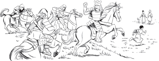 When Tom looked up, his face went white with fear. A wave of samurai horsemen was crashing down on them!
