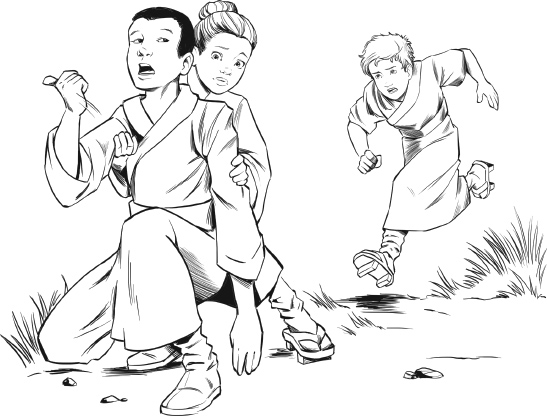 Tom opened his eyes, amazed he was still alive. The samurai had pulled up their horses at the last second, and were now fanning out round Tom, Zuma and the boy. Within seconds, they were surrounded.