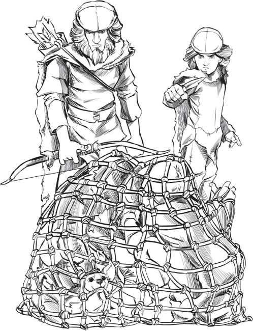Two shadowy figures dropped down from the treeâs upper branches, landing on either side of the net. Tom cried out in surprise. He tried to stand up, but the more he thrashed about, the more tangled up he got. The figures leaned in closer, peering at their catch through the gaps in the net. One was a grown man, the other a young boy.