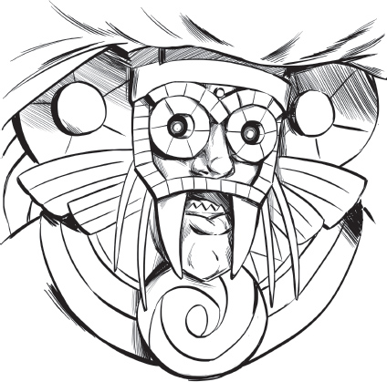 Zuma looked up to see a creature with blue skin and long, sharp fangs, like a jaguar. He carried a wooden drum and wore a feathered headdress, just like Zumaâs.