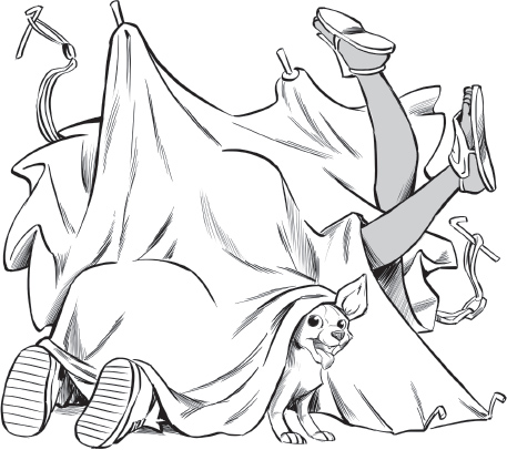 Sheepishly, he helped his dad put the tent back up, and by then it was getting dark. As his dad prepared a camp fire, Tom went inside his tent to unroll his sleeping bag. Zuma carefully crawled in after him.