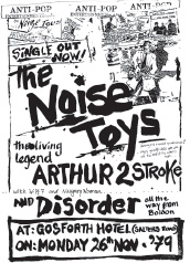 Admission to the function room was 50p, payable at the top of the stairs. As proof of payment you got your hand stamped ‘anti-pop entertainmenterama’. Sitting on the door counting the money was a scruffy bloke who looked as if he’d just spent a night on a park bench, and then walked through a particularly severe sandstorm. His name was Andy Pop and he always looked like that due to a combination of Brillo pad hair and bad eczema. Andy was the business brains behind the Anti-Pop organization. Sitting alongside him was his partner, the creative guru, a tall, thin man called Arthur 2 Stroke. Arthur 2 Stroke’s eponymous three-piece band were playing that night, and Jim had recommended them highly. 2 Stroke cut a bizarre figure on stage. He was an awkward, gangly sort of bloke, dressed in a dandy, second-hand, sixties’ style. He wore a powder blue mod suit that was far too small for him and a comically extreme pair of winkle-picker boots, and he had an unmistakable Mr Spock haircut. He was a bit like a cross between Paul Weller and Jason King. He couldn’t sing very well, or play the guitar, but he had a wonderful comic aura about him. Next to him was an upright, smiling, red-haired guitarist who went by the name of WM7, and in the background there was an almost unseen drummer whose name was Naughty Norman. Their manic set included a half-decent cover of ‘The Letter’ and a plucky tribute to the well-known 1970s French TV marine biologist, ‘The Wundersea World of Jacques Cousteau’. Also on the bill that night were the Noise Toys, a power-packed post-punk four-piece who bounced around in oversized baggy suits and raincoats, shaking the ceiling of the old codgers’ bar below. Singer Martin Stevens was a timid, slightly built, shaven-headed bloke – a more energetic, better-looking, heterosexual version of Michael Stipe. In total contrast his sidekick, the trilby-hatted guitarist Rupert Oliver, was a bullish, ugly, bad-tempered prima donna, prone to lashing out at the audience with his microphone stand. The rhythm section were the industrious but less noteworthy Mike and Brian, and the highlights of their set were their own song ‘Pocket Money’ and memorable covers of ‘Rescue Me’ and ‘King of the Road’. As well as the Noise Toys and Arthur 2 Stroke there’d be anything up to three or four other bands on the bill, and a lot of them would be playing their first ever gig. Anti-Pop’s policy was to encourage kids to come along and have a go. You didn’t need fancy equipment, or talent. Anyone could ring them up and book a support slot. This was the punk ethic being put into practice, and it attracted quite a few weirdos. But it was always entertaining, intimate and exciting – the very opposite of going to Knebworth to see Rush or lying on the floor and listening to Pink Floyd. At the Gosforth Hotel I felt like I’d found my spiritual home.
