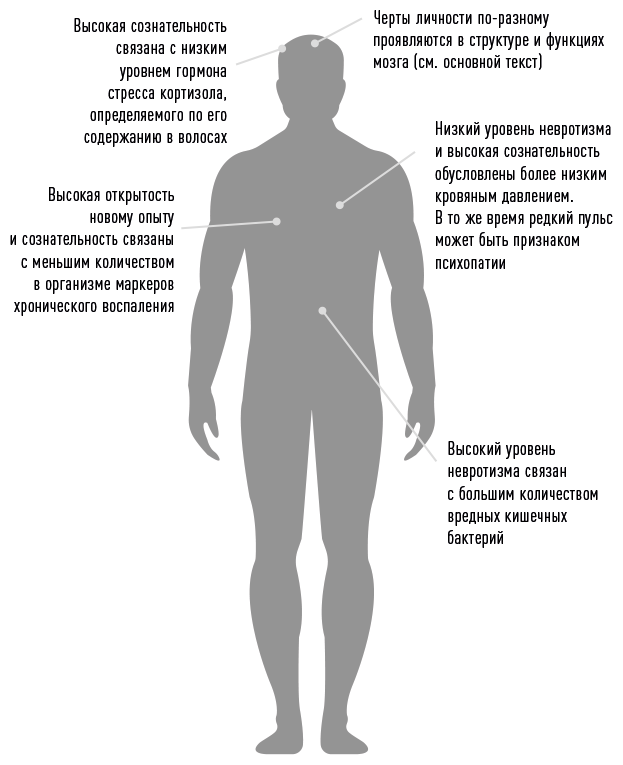 Принято считать, что понятию «личность» невозможно дать определение, что рассматривать его можно только на основе описательного подхода, но на самом деле оно очень точно отражает биологическую структуру своего носителя, вплоть до устройства и функционирования мозга. Например, стремление к тишине и покою для интровертов не просто прихоть – их мозг более чувствителен к громким звукам. Эмоционально неустойчивые невротики чаще страдают от перепадов настроения не потому, что им этого хочется, а из-за меньшего количества складок и, соответственно, меньшей площади поверхности коры головного мозга в зонах, отвечающих за регулирование эмоций[12]. У людей с ярко выраженными благоприятными чертами, такими как эмоциональная устойчивость и сознательность, миелиновые оболочки нейронов в переднем отделе мозга более плотные и проводимость электрических сигналов, а значит, и эффективность взаимодействия нервных клеток выше[13]. Факторы, определяющие личность, напрямую связаны даже с микробиомом желудка – у невротиков количество вредных кишечных бактерий в нем намного больше[14].