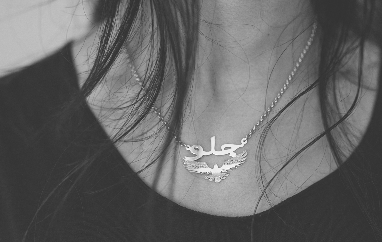‘This is his name,’ she added, touching the inscription on her peacock pendant.