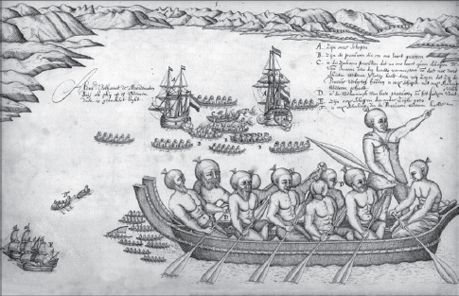 Early the next morning, a canoe came out to the ships. Once again, the islanders called out, and this time the Dutch made signs for them to come aboard, showing them white linen and knives. The men in the canoe could not be persuaded, however, and after a little while they returned to shore. Tasman held a second council, at which it was decided to bring the ships closer inshore, “since there was good anchoring-ground and these people (as it seems) are seeking friendship.” But before the ink was even dry on this resolution, a fleet of seven canoes set out from shore. Two of these took up positions nearby, and when a small boat ferrying men from one of the Dutch ships to the other passed between them, they attacked it, ramming the boat, boarding it, stabbing and clubbing the men, and throwing the bodies overboard. The attack was fast, furious, and effective; three of the Dutch sailors were killed instantly, one was mortally wounded, and three more were eventually rescued from the sea. The sailors on board the ships fired their guns, but they were too far away or too late or just too inaccurate, and the islanders escaped to safety, taking the body of one of the Dutch sailors with them as they went.