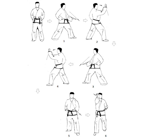 1.Шаг в левую Гуннун-соги с блоком левой рукой на нижнем уровне наджиндэ-сонкаль-макки.