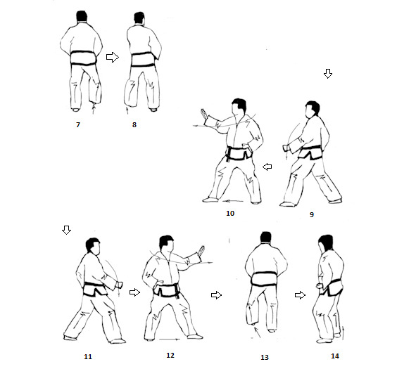 7.Разворот на 180 градусов с шагом в правую гуннун-соги с блоком правой рукой на нижнем уровне наджиндэ-сонкаль-макки.