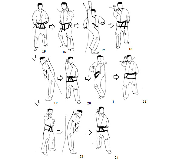9.Поворот на 90 градусов влево и шаг левой ногой в левую гуннун-соги с блоком левой рукой на нижне уровне пальмок-наджиндэ-макки.