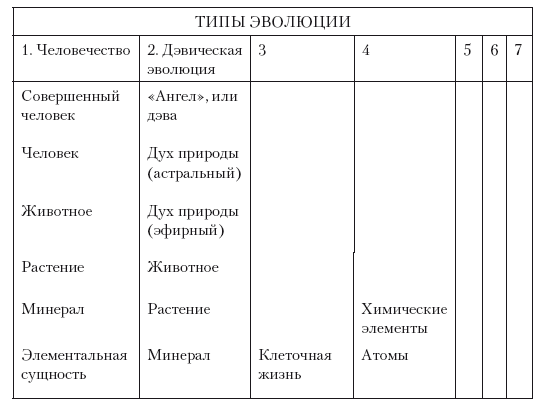 Жизнь использует организмы из твердой, жидкой и газообразной материи, но наряду с этим она использует формы и из более тонкой материи в ее «четвертом состоянии» (теософы называют такое состояние «эфирным»), а также из более разреженных типов материи – астральной и ментальной. Начиная с минералов выделяются шесть разных линий эволюции, сходящихся к двум вершинам – Адептам, или Совершенным Людям, и к Арупа Дэвам, или Совершенным Ангелам, а они в конечном итоге сливаются в один тип высоких сущностей, называемых Дхиан-Чоханами. Из этих шести только две линии используют физическую материю в ее более тонком, или эфирном, состоянии (1-я и 3-я колонки диаграммы) и затем выстраивают формы из астральной материи, такие как «сильфы». Одна линия создает организмы, живущие в воде, в то время как другие используют формы, обитающие на суше. И только одна из шести линий ведет к человечеству, другие пять уходят в параллельную линию эволюции дэвов, или ангелов.
