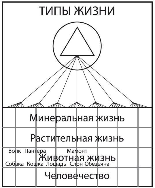 Линия жизни, которая в дальнейшем должна стать человеческой, уже имеет зачаточные признаки будущей специализации, даже на самых ранних своих стадиях: элементальной, минеральной и растительной; более заметной она становится на этапе животного царства. Существуют семь основных типов жизни, которая в дальнейшем станет человечеством, и в каждом типе имеются видоизменения вследствие влияния их друг на друга. Эти типы сохраняются на протяжении всех предшествующих человеку царств. Жизнь собак всегда отличается от жизни кошек, а жизнь слонов – от жизни тех и других. Жизнь собаки развивалась через формы волков, шакалов и других представителей семейства псовых до тех пор, пока не достигла своего наивысшего воплощения в домашней собаке. Подобным образом и другие типы животной жизни, такие как кошки, лошади, слоны, обезьяны, также ранее воплощались в более диких и доисторических формах своего вида. (Эта тема будет рассмотрена более подробно в главе 7 «Эволюция животных».)