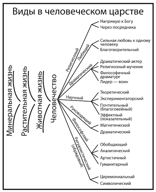 Когда мы подходим к исследованию этих типов на этапе человечества, перед нами открывается захватывающая картина. Не нужно обладать большим воображением, чтобы увидеть, что жизнь семейства псовых при переходе к человеческой линии проявится как религиозный тип души. Классификация, представленная на рис. 11, ни в коей мере не является окончательной. Это скорее предположение, нежели абсолютный в своей истинности ключ к тайне человеческих характеров.