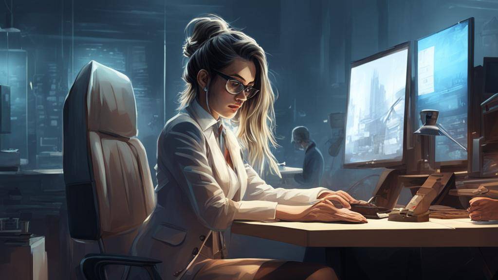 María está en la oficina, en su traje de moda, sentada frente a la computadora.
