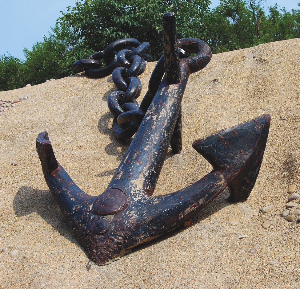 An anchor is a heavy metal hook on a long chain. It is dropped over the side of a boat to stop it moving.