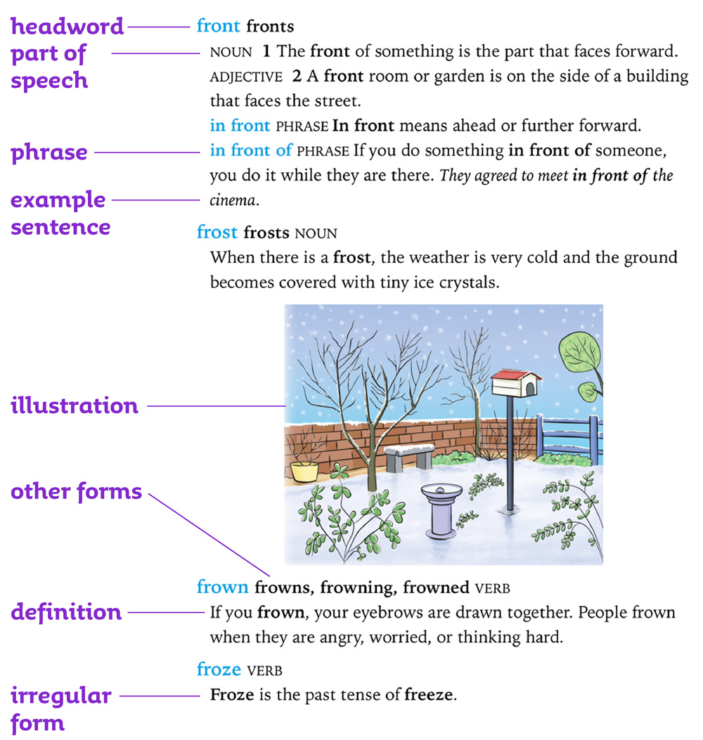 Some definitions tell you where to look for more information, such as another headword, or the pages at the back of the dictionary.