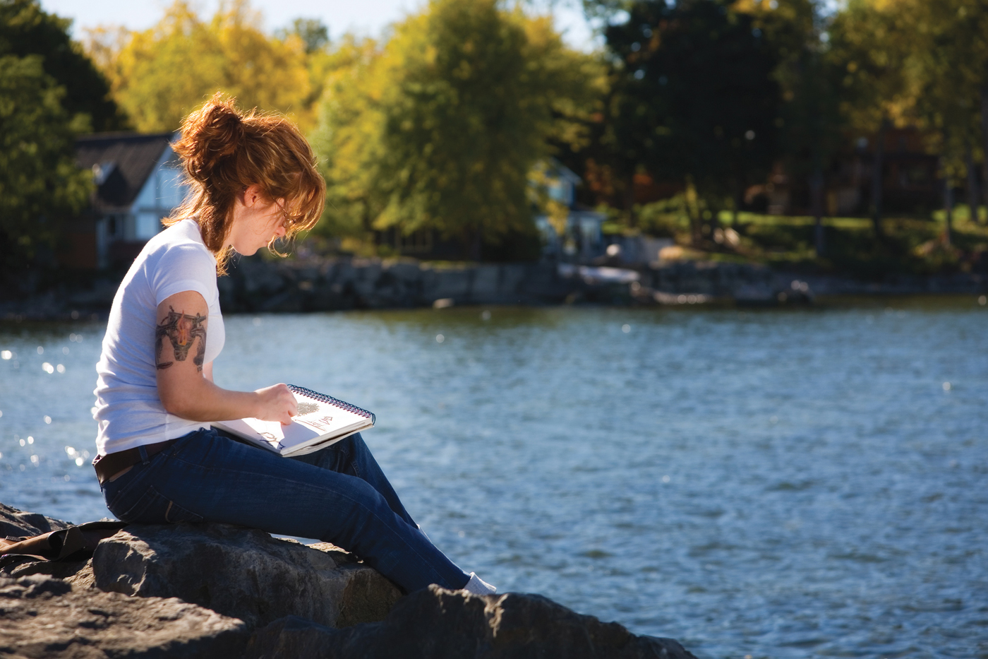 The artist sat by the lake sketching the view.