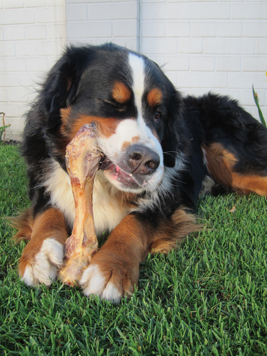 Boggart happily lay down in the garden and gnawed his bone.