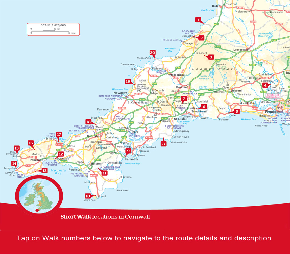 Cornwall is one of Britain’s principal holiday destinations. The county occupies the most southwesterly part of England, a peninsula bounded to the north and west by the Atlantic Ocean and warmed by the waters of the Gulf Stream to an extent that mild winters allow exotic plants to flourish in sheltered places. The sea is never more than 20 miles away and the coast is the main attraction of the county for most visitors. Inland, both the rugged landscape of moorland and the gentler scenery of woodland, valleys and farmland – as well as the remains of over 5000 years of history – are all worthy of exploration. There could be no better way to experience these landscapes than to follow one or more of the routes in this guide. The walks have been carefully chosen to introduce a cross section of countryside, with a selection of places of interest along the way.