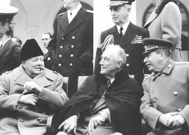 2. Ялтинская конференция, февраль 1945 года. Слева направо: Черчилль, Рузвельт, Сталин; за спиной Рузвельта стоит начальник Штаба президента США Уильям Лети. Сталин дал слово вступить в войну с Японией через три месяца после капитуляции Германии, а в ответ Рузвельт обещал передать СССР права на Южный Сахалин и Курилы и согласился с тем, что русские обладают «преимущественными интересами» в Маньчжурии. РГАКФД
