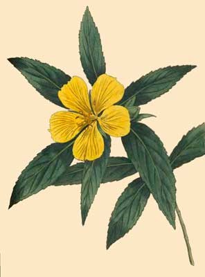 This plant here represented is generally known to the Nurserymen about London as the Turnera ulmifolia, or Elm-leav'd Turnera, its foliage however does not answer to the name, nor to the figures of the plant as given by Martyn in his Cent. Pl. and Linnæus in his Hortus Cliffortianus, which figures indeed are so similar that they look like copies of each other, these represent the true elm leaf; on the same plate of Martyn's Cent. there is given a very excellent figure of what he considers as another species of Turnera, vide Synon. and which Miller, who cultivated it about the year 1773, also describes as a distinct species, under the name of angustifolia, asserting, from the experience of thirty years, that plants raised from its seeds have constantly differed from those of the ulmifolia; this is our plant, which on his authority we have given as a species, though Linnæus regards it as a variety.