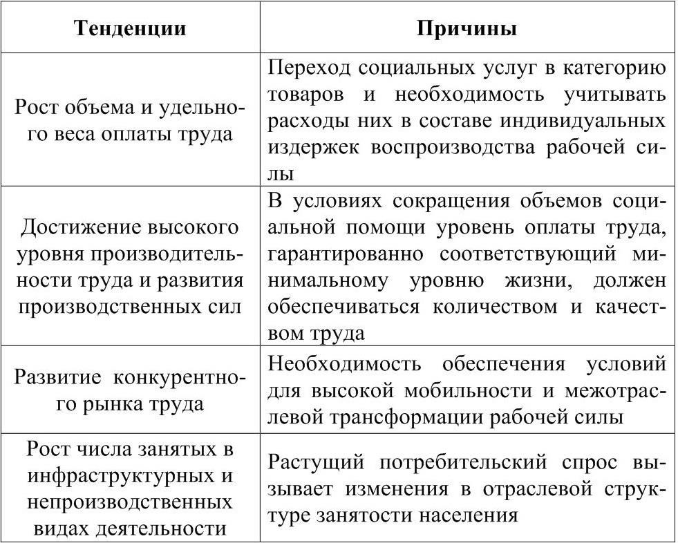Воспроизводство рабочей силы в рыночных условиях обуславливает возникновение следующих основных тенденций, связанных с объективными причинами, вызванными переходом к рыночным отношениям (табл. 1).