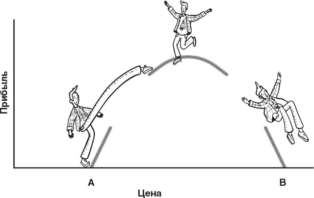 При увеличении цены, начиная от цены A, кривая маржинальной прибыли на нашем графике будет двигаться вверх. А в точку B график приходит сверху.