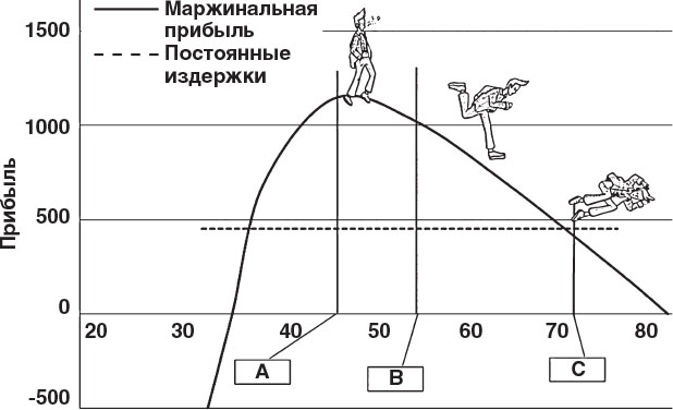 При цене между A до B продажи будут отличаться от нуля, а разница между ценой и переменными затратами на единицу товара будет положительной. И, значит, в этом промежутке мы всегда будем получать маржинальную прибыль.