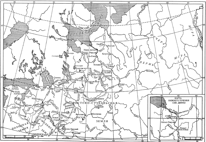 Влияние Юрьевичей сказывалось и за западной границей их владений, в Смоленске. Эти земли после смерти Владимира Мономаха (1125) были переданы деятельному сыну Мстислава Великого Ростиславу, активность которого привела к закреплению стола за его потомками. В 1154 г. Ростислав после смерти брата Изяслава получил Киев, но был выбит оттуда черниговцами Изяслава Давыдовича. Вторично завладев древнерусской столицей в 1159 г., Ростислав сохранил ее до своей смерти в 1167 г. В Смоленске ему наследовали сыновья: Роман, а затем Давыд. Их брат Рюрик, имевший держания как в Киевской, так и в Смоленской землях, неоднократно владел Киевом в период с 1173 по 1211 г. После смерти в 1230 г. Мстислава Давыдовича, старшего из второго поколения Ростиславичей, смоленский стол более двух лет оставался вакантным. Вероятно, смоляне не хотели впускать в город естественного наследника – Святослава Мстиславича, владевшего после 1223 г. Полоцком. Несмотря на сопротивление горожан, в 1232 г. Святослав подошел с полочанами к Смоленску и взял город «на щитъ»[11]. Судя по всему, этот князь удерживал за собой землю вплоть до 1238–1239 гг., когда летопись представляет уже Ярослава Всеволодовича (переяславль-залесского) распоряжающимся смоленским столом.