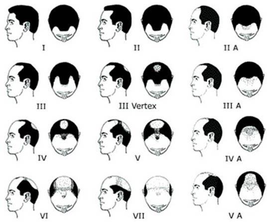 Андрогенетическая алопеция развивается стадийно и оценивается по шкале Норвуда (для мужчин) и шкале Людвига (для женщин).