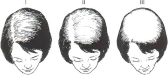 У женщин этот тип облысения прогрессирует медленнее и обычно сводится к диффузному поредению волос, более выраженному также в лобно-теменной области.