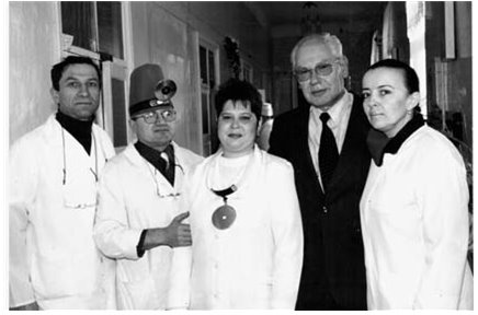 Фото 2. Доцент Геннадий Михайлович Пеньковский со своими учениками: к. мед.н., зав. ЛОР-онко отделением 11 ГКБ г. Одессы Пилипюк Н.В., проф. Евчев Ф.Д., канд. мед. наук, городской фониатр, Добронравова И.В., проф. Пионтковская М.Б.