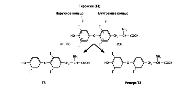 В переводе с латинского слово «реверсивный» означает «обратный». Эта форма гормона трийодтиронина отличается от обычного активного Т3 другим расположением атома йода (рис. 3).