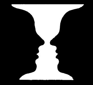 На этом рисунке можно увидеть и фигуру в форме вазы, и два человеческих лица, обращенных друг к другу. При этом на рисунке нет двух объектов; тут налицо один объект, но, в зависимости от того какое впечатление он на нас производит, мы видим либо одну, либо другую картину. Отношение частей к целому в одном случае полностью противоположно отношению частей к целому в другом случае. Если взяться за описание одного из лип, мы, двигаясь последовательно сверху вниз, выделим лоб, нос, верхнюю губу, рот. подбородок и шею. Хотя мы описали ту же линию, которая при ином рассмотрении может превратиться в контур вазы, в своем описании мы вели речь не об очертаниях вазы, а о человеческом лице.