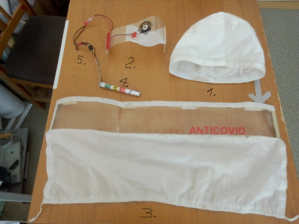 Комплектующие: 1.Колпак (медицинский) 2.крепежная пластина с вентилятором (под вентилятором защитная сетка или ткань от попадания волос). 3. полоска из оргстекла защитная с «юбкой» (на полоске приклеиваются поролоновые кубики для прилегания к голове. 4.аккумуляторы 5.выключатель. Вы можете сами изготовить СИЗ повышенной комфортности и надежности, на Вашу голову не попадет ни один вирус и ни одна пылинка. Прохладный ветерок будет обдувать Вас в жаркий летний день (если к вентилятору (снизу) прикрепить на липучке кусочек поролона (губку для раковины), смоченную водой (с ароматизатором) ветерок превратится в морской бриз, наполненный запахами прибрежных мандариновых садов и миндальных рощ.