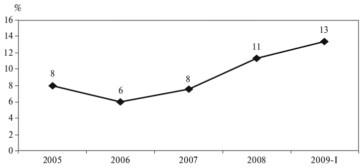 Еще одной проблемой для банков стала возрастающая скорость досрочного погашения ипотечных кредитов. Если в 2005–2007 гг. ежегодно досрочно погашалось около 6–8 % задолженности по ипотечным кредитам, то в 2008 г. – уже 11 %, а в первом полугодии 2009 г. – 13 % (рис. 1.13). Это означает, что фактический срок жизни 15-летнего кредита, выданного под 14 % годовых, сократился с 8,8 года в 2006 г. до 6,3 года в первой половине 2009 г.