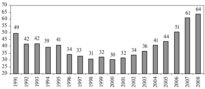 Рис. 1.14. Ввод жилья в России за 1991–2008 гг., млн м2 общей площади жилья