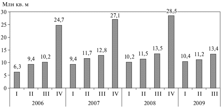 Необходимо заметить, что традиционно основной объем ввода жилья приходится на IV квартал (в 2008 г. было введено 44,7 % годового объема). По итогам года можно было ожидать ввода примерно 60 млн м2 общей площади жилья, т. е. около 94 % ввода 2008 г.