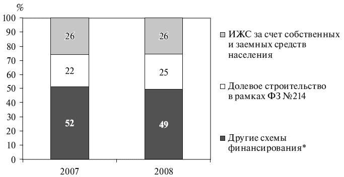 Несмотря на низкую долю жилищного строительства, которое обеспечивалось за счет кредитных банковских средств, некоторые особенно крупные застройщики осенью 2008 г. столкнулись с проблемой дефицита оборотных средств, получаемых за счет банковских кредитов. Одновременно в результате сокращения объемов кредитования граждан – участников строительства многоквартирных домов, а главное, эффекта отложенного спроса на жилье, вызванного ожиданиями покупателей относительно снижения цен на жилье, уменьшился спрос на жилье на первичном рынке.