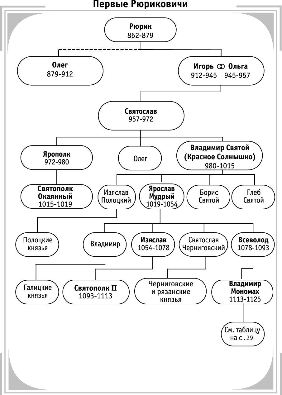 Представители рода Рюриковичей, которые занимали престол (до 882 г. – в Новгороде или Ладоге, с 882 г. – в Киеве), а также наиболее значимые князья, не правившие в Киеве. Киевские князья выделены полужирным начертанием, после их имен приведены годы правления. Знак означает брачный союз.