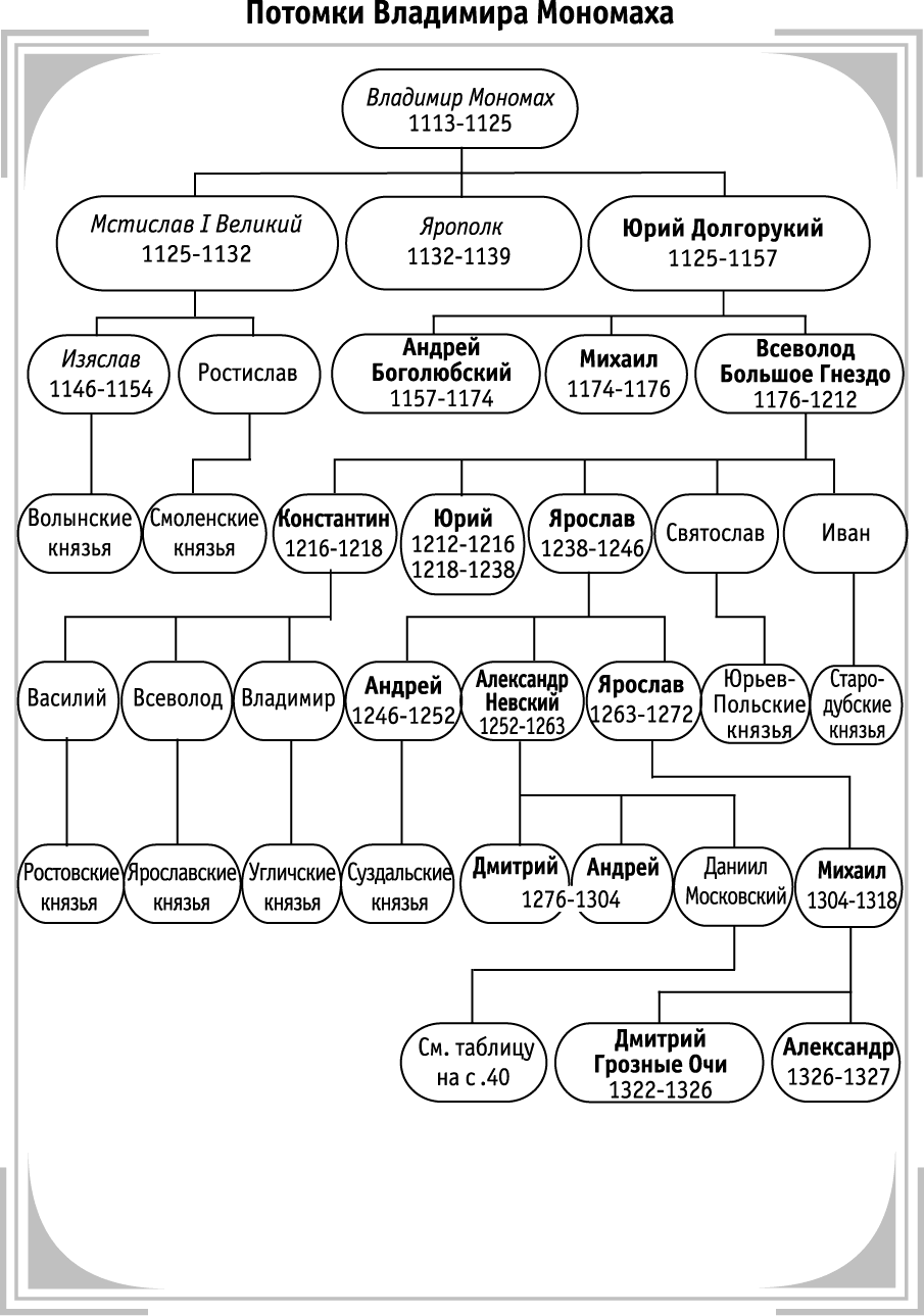 В таблице приведены представители рода Рюриковичей – потомки князя Владимира Мономаха. Помимо тех, кто занимал престол в Киеве, Суздале или Владимире, представлены родоначальники отдельных ветвей династии. Князья, занимавшие киевский престол, выделены курсивным начертанием, князья, занимавшие престол во Владимиро-Суздальской земле, выделены полужирным начертанием, после их имен приведены годы правления.