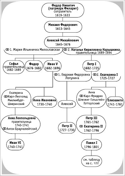 В таблице приведены только те представители Романовых, которые занимали престал, a также родоначальники отдельных ветвей династии. После царствовавших особ указаны годы их правления. Знак GD означает брачный союз.