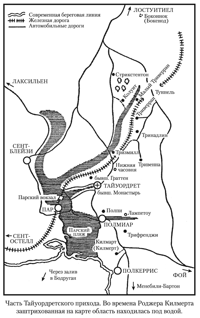 Дорога вела сначала через пахотные земли, затем резко пошла вниз. Совсем иной ландшафт открылся моему взору. Деревня Тайуордрет, которую я видел всего несколько часов назад, изменилась до неузнаваемости. Многочисленные дома, беспорядочно расположившиеся к северу и западу от церкви, исчезли. Теперь на этом месте находилось небольшое селение, своим примитивным видом напоминавшее игрушечную ферму, которую я, помню, строил на полу своей комнаты в детстве. Маленькие приземистые дома, крытые соломой, теснились вокруг большого общинного луга, по которому разгуливали свиньи, гуси, куры, два или три стреноженных пони и сновали вездесущие собаки. Над этими убогими жилищами поднимался дым, но он выходил не из труб, а из отверстий в крыше. Сразу за селением стояла церковь, и здесь уже красота и гармония вновь вступали в свои права. Но это была не та церковь, которую я видел несколько часов назад. Она была поменьше и без башни; вплотную к ней примыкало длинное невысокое каменное строение, и все это было окружено каменной стеной. За стеной тянулись огороды, сад, служебные постройки и небольшой лесок. А далее – спуск в долину, где виднелся глубоко врезавшийся в нее залив.