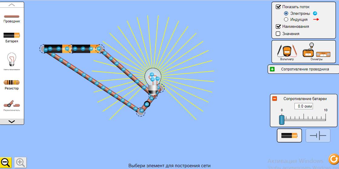 Истифодабарии симуллятор дар мавзӯъи қувваи электрикӣ, пайваст кардани лампочка бо батарея