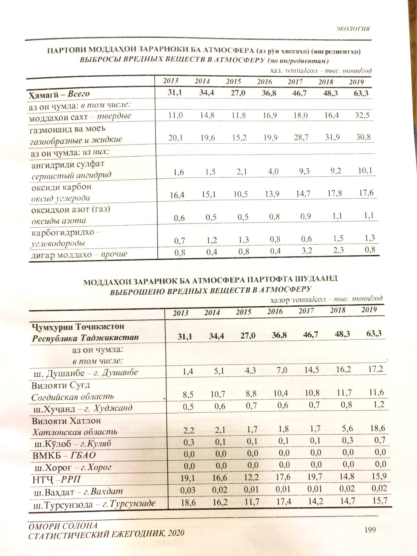 Манбаҳои асосии доимии партовҳо ва ифлосшавии ҳаво дар Тоҷикистон корхонаҳои металлургӣ ва сементбарорӣ, инчунин марказҳои обугармидиҳии бо ангишт коркунанда ба ҳисоб мераванд. Тағйиротҳо дар сохтори саноат барои камшавии партовҳои моддаҳои ифлоскунанда мусоидат намуданд.