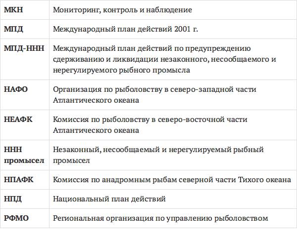 По последним оценкам ФАО, ежегодный ущерб мировой экономике от незаконного вылова рыбы составляет от 10 до 23 млрд долл. США. Речь идет о 26 млн т морепродуктов, что составляет 15 % от суммарного мирового улова9.
