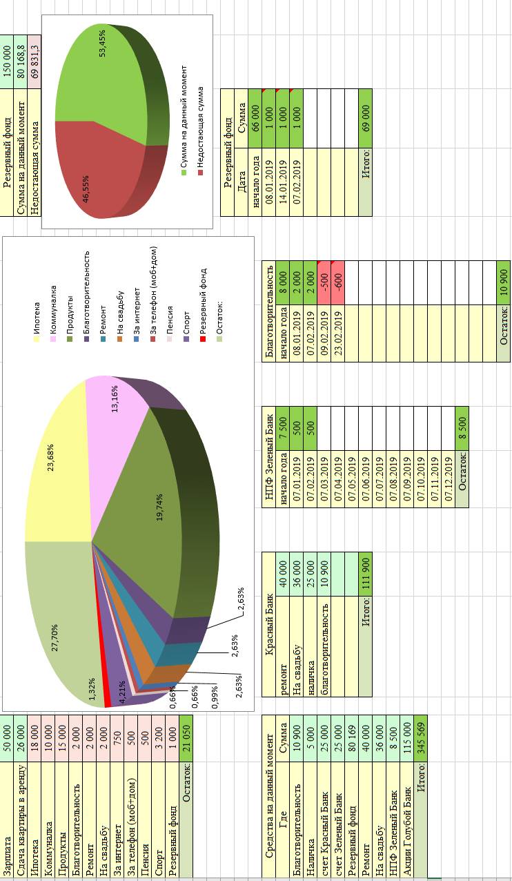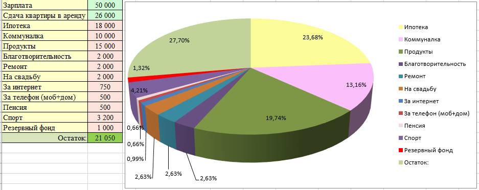 Среди обязательных трат, особо стоит отметить выплаты по ипотеке. В наше время такие траты есть практически у каждого, а у кого ещё нет, то возможно планируются в будущем. Если ваши выплаты по ипотеке, как и в нашем примере, «съедают» такую большую часть бюджета, это видно на диаграмме, то ваша первоочередная задача состоит в том, чтобы снизить затраты по этой статье, хотя бы до 15-20%.
