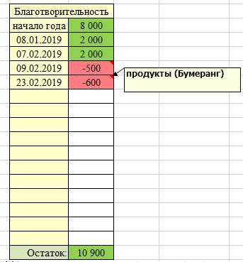 К примеру, я поступаю следующим образом, каждый месяц откладываю определенную сумму с зарплаты и перевожу эти деньги на отдельный счёт. Когда выдаётся более или менее свободный денёк, я покупаю продукты или лекарства и отношу их в благотворительную организацию, где их раздадут нуждающимся. Иногда бывает, что деньги на счёте копятся по несколько месяцев из-за моей сильной загруженности или если я собираюсь купить что-то дорогое для благотворительных целей, и тут главное чётко определить для себя и всегда помнить, что деньги, выделенные на благотворительность это уже не мои деньги. Эти деньги лежат на отдельном счёте и потратить их я могу только на благотворительность и не на что другое. На рисунке ниже представлен пример таблицы посвящённой благотворительности. В этой же таблице для себя можно делать небольшие заметки, в ячейках с тратами, и отмечать на что именно были использованы денежные средства. Таблица состоит всего из двух столбцов. В первом указывается даты пополнения счёта, а также даты, когда происходил расход денежных средств. Во втором столбце фиксируются денежные суммы. И в самом конце указывается остаток финансов на благотворительные цели.