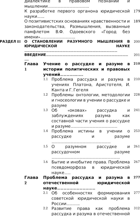 Сказанным обусловлена общая структура исследования. Первый раздел посвящен краткому анализу учений об уме, созданных выдающимися мыслителями прошлого, что позволяет выявить основные предпосылки для анализа правового мышления. Второй раздел содержит результаты исследований отдельных проблем правового мышления. Третий раздел представлен учением о рассудке и разуме, как составной части учения об уме в его применении к отечественной юридической науке.