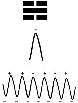 Есть всего две симметричных гуа, в которых присутствуют и Инь, и Ян. Это Кань и Ли, или «Вода» и «Огонь». Во всех остальных гуа Инь и Ян распределены несимметрично. Чтобы понять это, нужно многократно повторить вибрацию гуа, создав длинную волну, как показано на рисунке 1.11 на примере Кань-гуа.