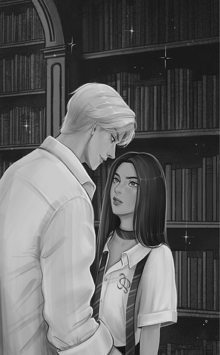 Внезапно чувствую, как крепкая рука хватает меня за талию. Одним резким движением он припечатывает меня к шкафу. Мое сердце колотится как сумасшедшее, дыхание сбито. Я поднимаю взгляд и вижу его перед собой: глаза горят, лицо напряжено. Вокруг нас книги и высокие стеллажи, но где-то там находятся студенты… хотя сейчас кажется, что мы одни в этом укромном уголке библиотеки. Его рука все еще держит меня за талию, и я чувствую его силу и злость.